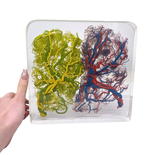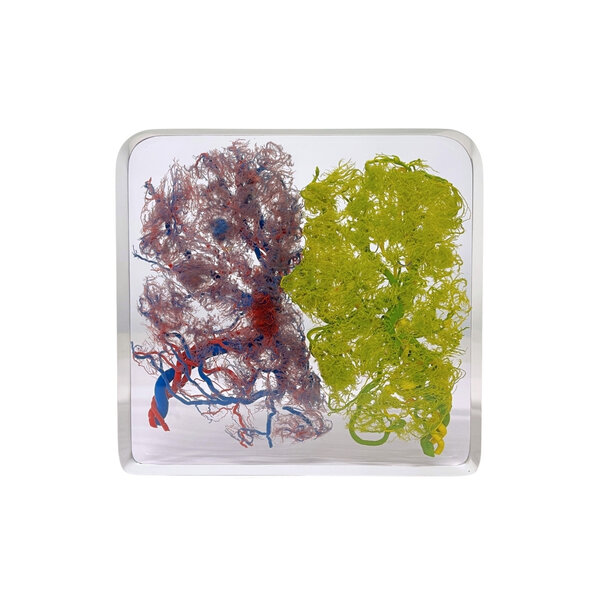 Korrosionspräparate werden in der Anatomie und Biologie häufig verwendet, um die Struktur von Blutgefäßen und Organen besser untersuchen zu können. Dieses Präparat bietet daher einen faszinierenden Einblick in die menschliche Anatomie und zeigt auf beeindruckende Weise, wie raffiniert und komplex das Gefäßsystem der Plazenta ist.