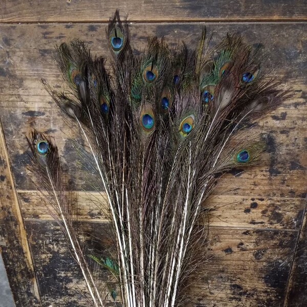 A bouquet of 50 peacock feathers, slightly damaged but still perfect for interior decoration and creative projects.