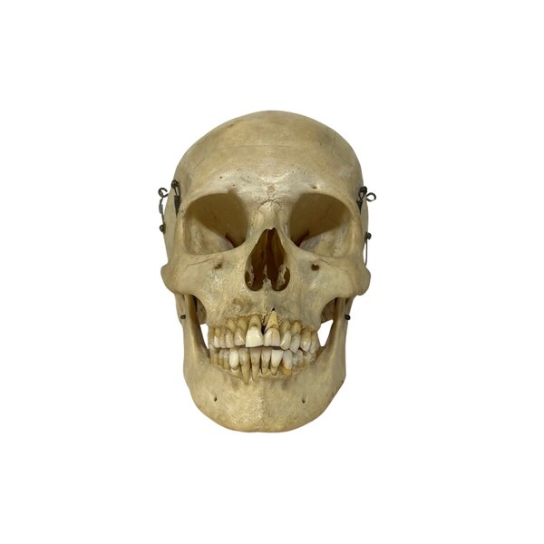 Incredibly beautiful real human skull. This skull is incredibly intact and has springs attached to the jaw so you can move the jaws open and closed. Also, the top of the skull has been sawn through so you can slide it open and see the inside of the skull. This beautiful skull comes in a fancy lockable box that is lined inside with purple velvet fabric.