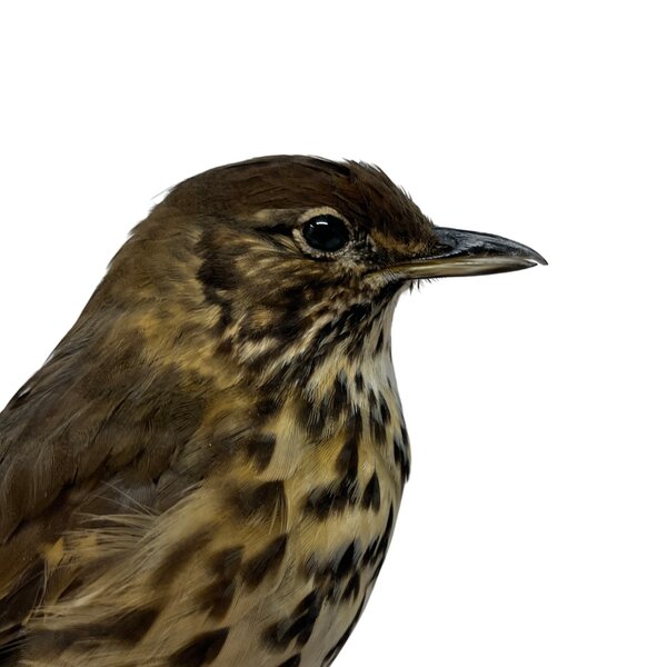 Beautiful stuffed song thrush, perched vividly on a branch as you might spot them in the wild.