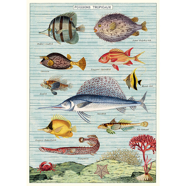 Beautiful school plate with various detailed images of fish. This poster, based on antique school plates, is very nice to use as wall decoration. This way you can easily give your room a vintage look.