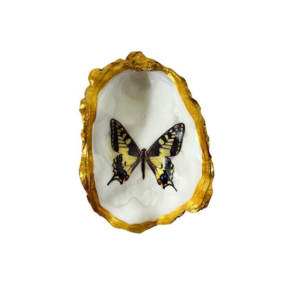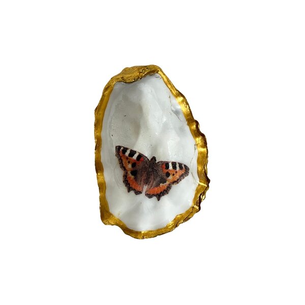 Vrolijke, met de hand versierde oester met verschillende natuurlijke printen. Onder andere vlinders en vogels.