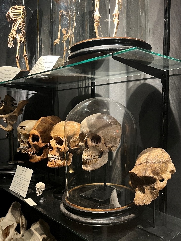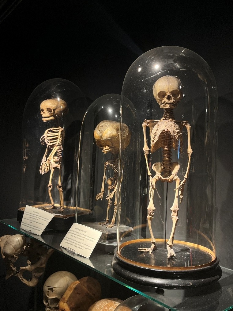 Tussen de oude onderwijsskeletten staat een fragiel kinderlichaampje met een opvallend vergrote schedel, een gevolg van hydrocefalie, ook wel een ‘waterhoofd’ genoemd. Het kindje werd in 1890 na 31 weken geboren, vermoedelijk heeft de moeder dit niet overleefd. Ook vindt je er een opmerkelijk langwerpige schedel. Op het eerste gezicht lijkt het misschien sciencefiction: een schedel die onnatuurlijk langwerpig is, alsof het uitgerekt werd. Maar dit is echt, en zo’n 2000 jaar oud. Deze schedel komt uit Peru, waar het Collaguavolk de hoofden van hun baby’s bewust vervormde met houten platen. Niet als straf of bescherming, maar als teken van hoge status. Een langwerpige schedel betekende macht en afkomst. |